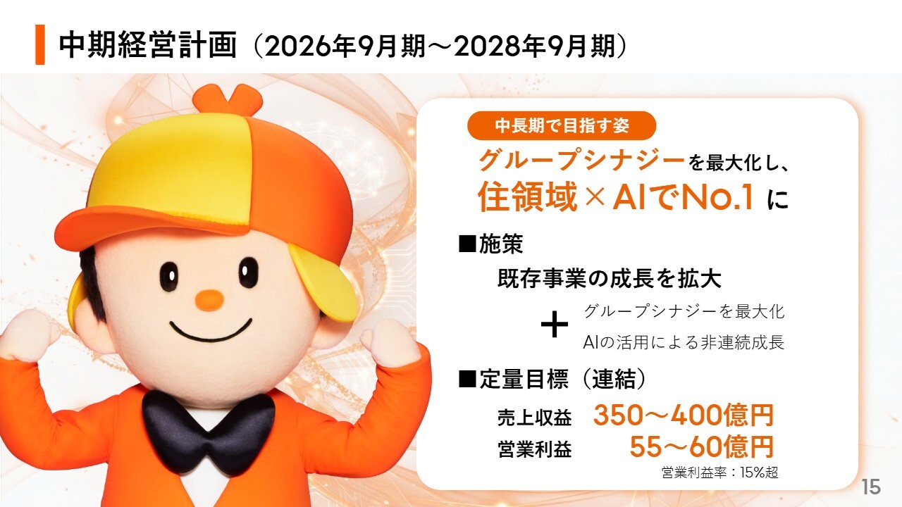 福澤:中期経営計画です。中長期で「目指す姿」として、「グループシナジーを最大化し、住領域×AIでNo.1になる」と掲げています。
