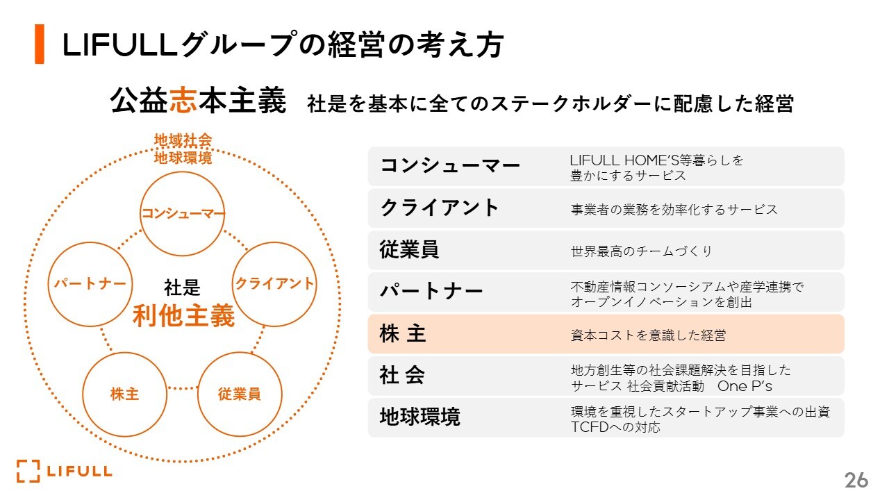 福澤:LIFULLグループの経営の考え方について少しご説明します。当グループでは、事業の成長とともに、「公益志本主義」「すべてのステークホルダーに配慮した経営」を志し、目指しています。