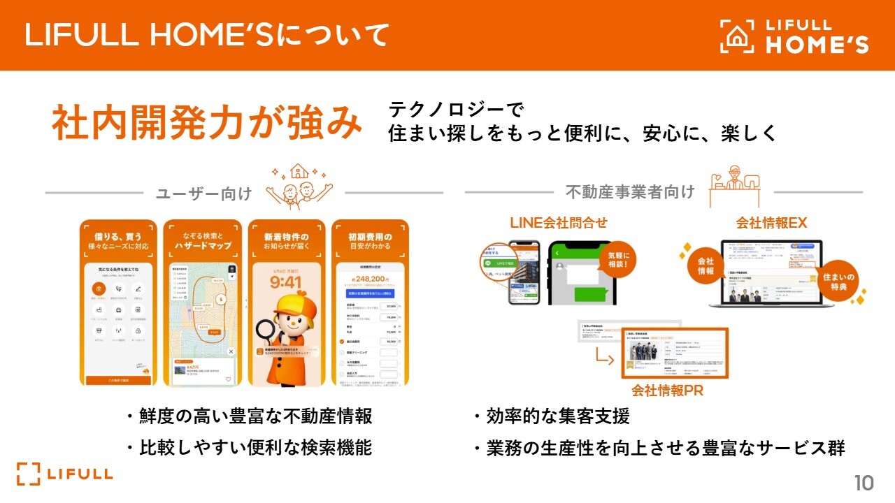 そのような背景から、ユーザーのみなさまのニーズに応え、ユーザーのみなさまが欲しいサービスを社内開発で積極的に取り組んできました。また、ユーザー向けだけでなく、スライド右側に記載のとおり、不動産事業者やクライアントのみなさまにも、便利なサービスを社内開発で提供し続けてきました。