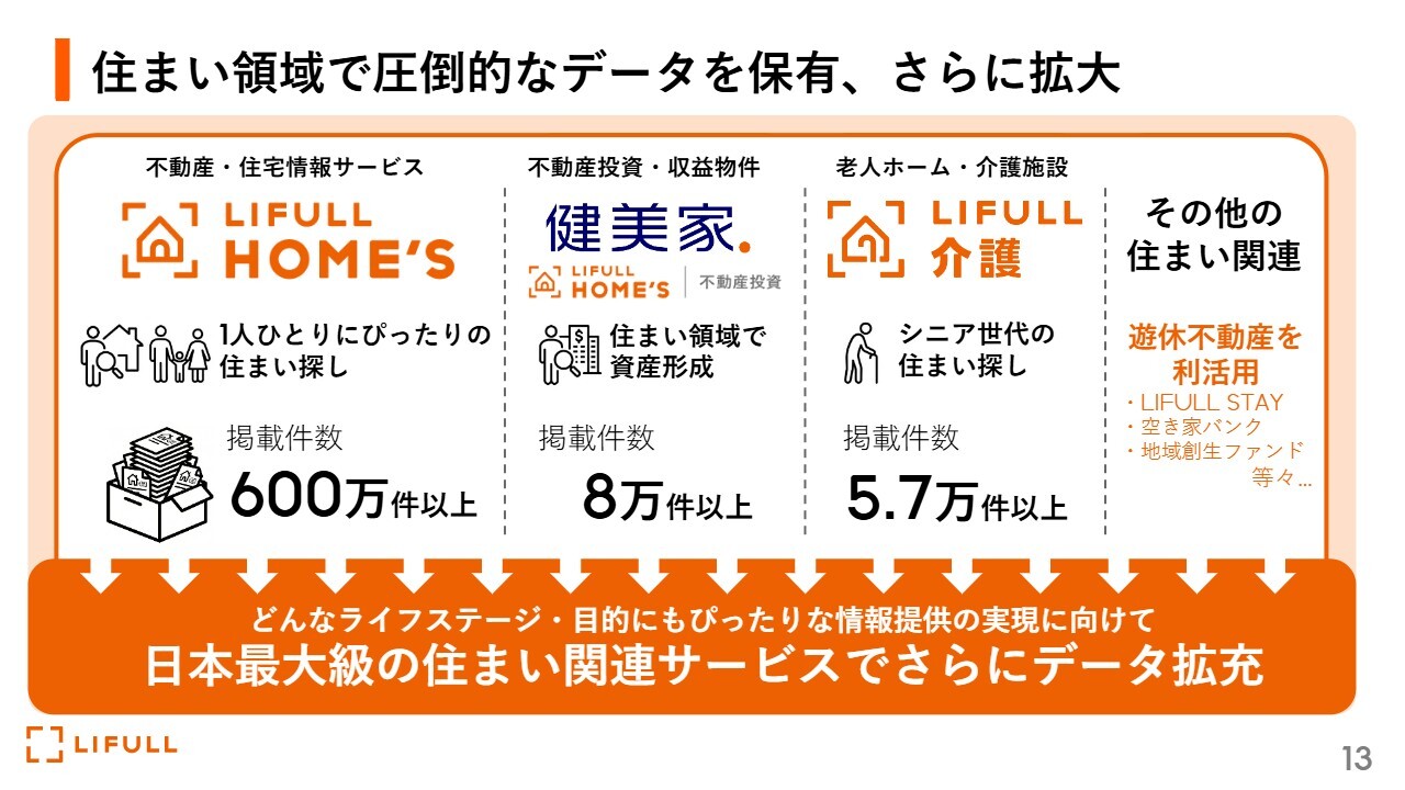 福澤:LIFULLグループの強みです。先ほどお伝えしたとおり、私たちには「LIFULL HOME'S」という物件数600万件以上が掲載されている情報データベースがあります。加えて、不動産投資に関する情報として8万件以上が掲載されており、「LIFULL 介護」と呼ばれる、シニア世代向けの介護施設の情報が5万7,000件以上掲載されています。