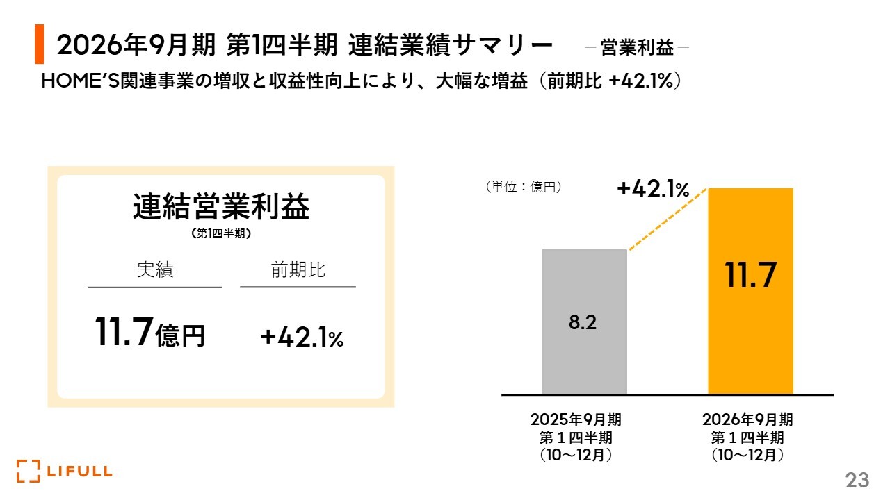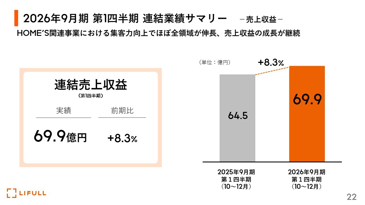 福澤:数字についてです。こちらは主力事業であるHOME'S関連事業を中心に大幅に伸長しています。売上収益は、前期比8.3パーセント増の69億9,000万円となりました。