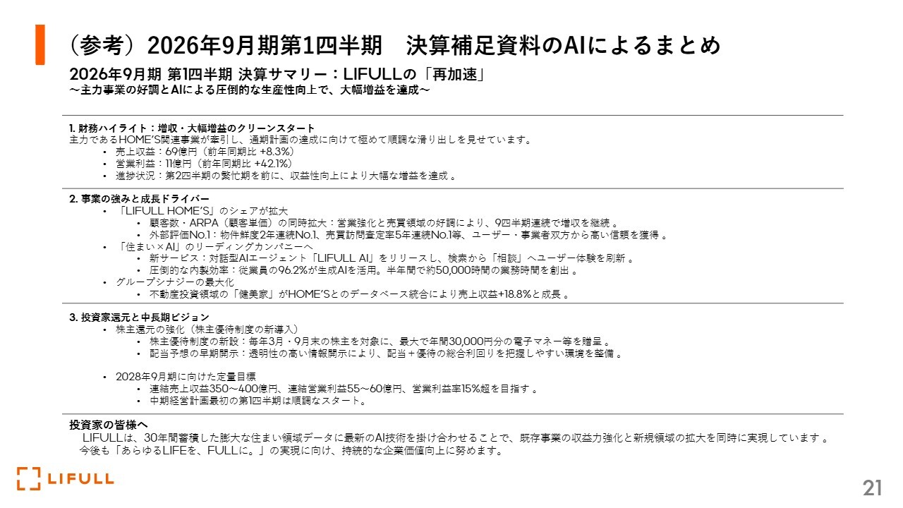 このスライドに関してですが、私たちがプレゼンテーション資料として2月12日に公表した決算補足資料の内容をもとに、生成AIが決算サマリーを作成したものです。文字が小さいため、要点をかいつまんでお伝えします。