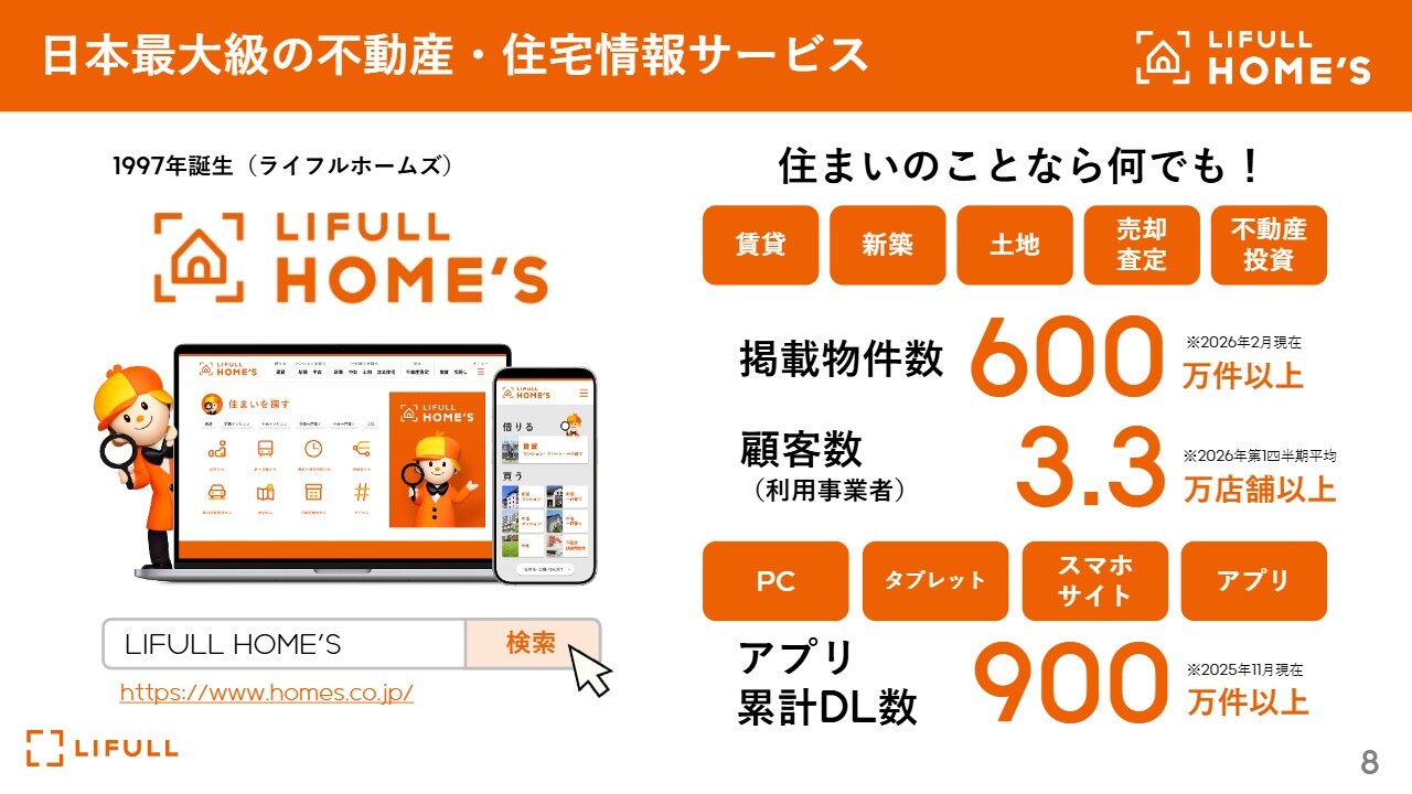 掲載物件数は、当社は重複物件を除外して公表しており、重複を除くと国内最大規模ではありますが、今後も顧客数の拡大と共に選べる情報を増やしていくこと、さらにその情報をAI等を活用したシステムで、よりユーザーのみなさまが便利に楽しく選べるようになることで、「LIFULL HOME’Sなら間違いない」と圧倒的な信頼で利用いただけるサービスとなって、事業拡大を目指していきたいと考えています。