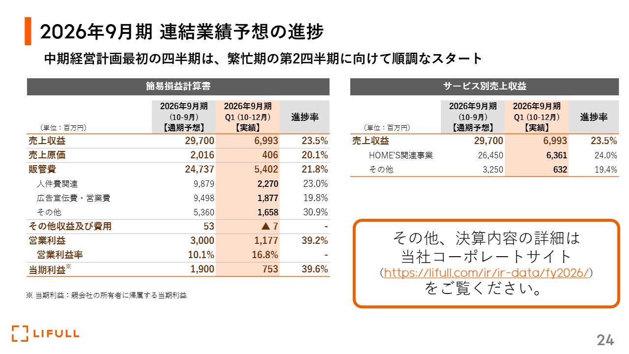 営業利益の業績予想は30億円で、現状の実績は11億7,000万円となり、第1四半期において非常に大きな利益成長を達成しました。第2四半期、第3四半期に向けて、ブランディングプロモーションや引っ越しシーズンに向けたプロモーション活動、さらには営業やAIへの投資を進める上で、よいスタートを切れたと考えています。