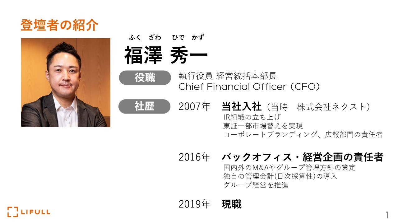 福澤秀一氏(以下、福澤):LIFULL CFOの福澤です。本日はよろしくお願いします。簡単に自己紹介をします。私はLIFULLに2007年に入社し、それ以来、IRやバックオフィス、資金まわり、M&Aなどを担当してきました。