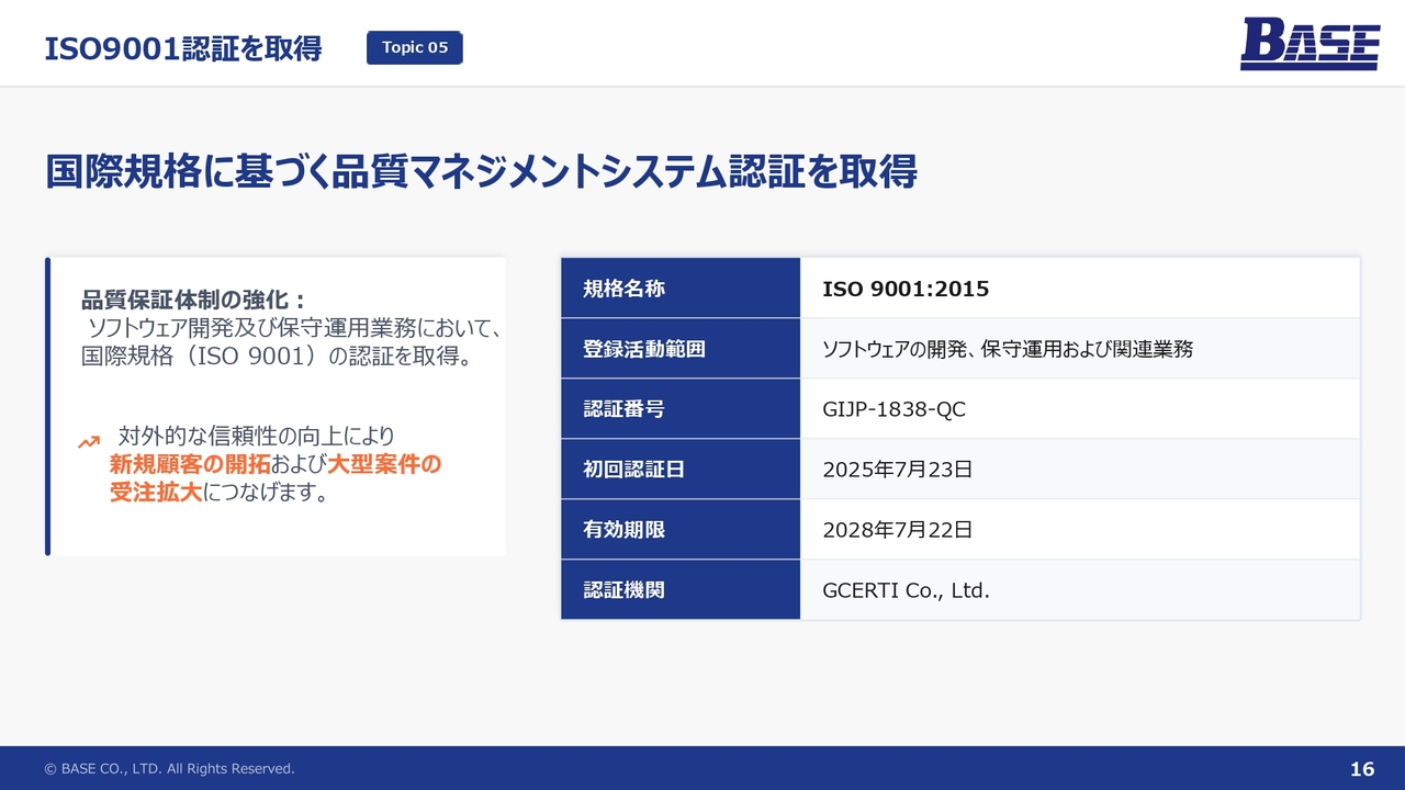 5つ目のトピックスは、ISO取得です。先ほどのお話にもありましたが、NTTデータさまのビジネスパートナーには非常に高い要求水準が求められます。売上や成長率といったさまざまな要求の中で、品質に関してどのような基準や資格を持っているかも重要視されています。