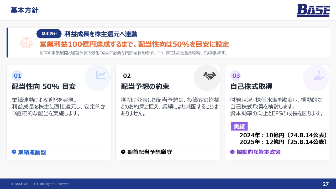 1つ目は配当性向についてです。以前からお伝えしているように、営業利益が100億円を達成するまで配当性向50パーセントを維持します。つまり、50パーセントを超えることはあっても、下げることはありません。