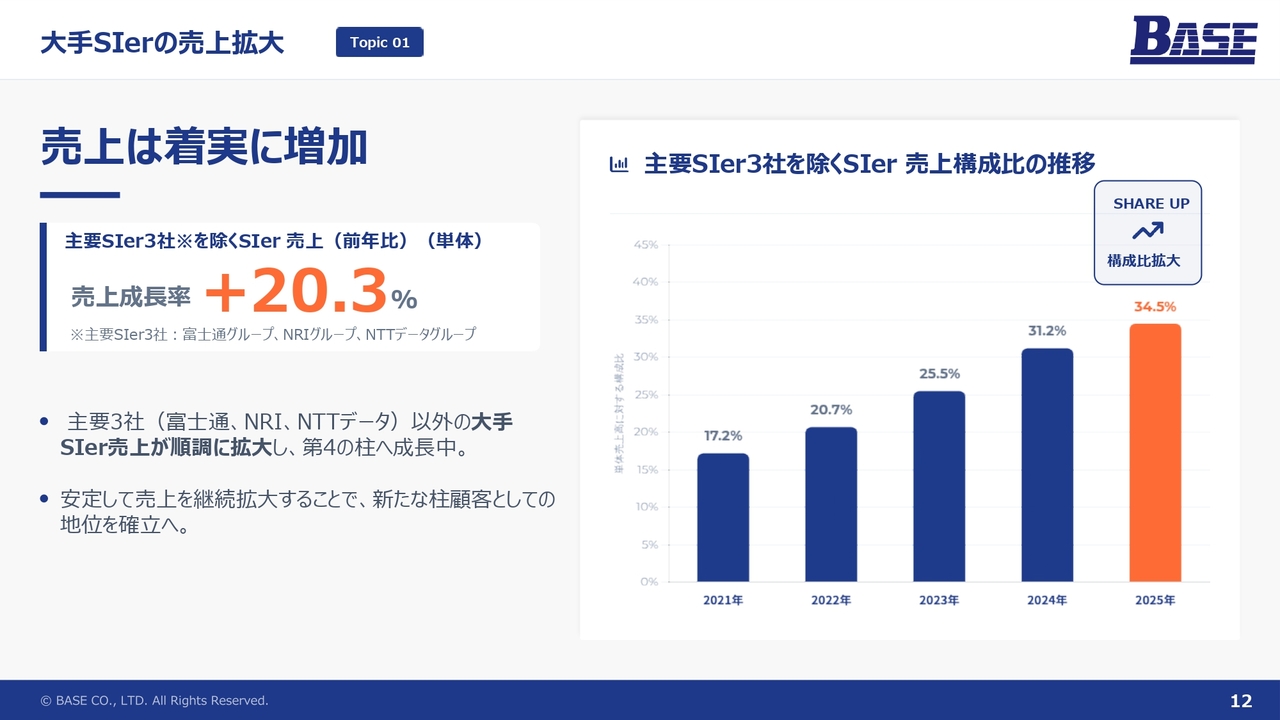 当社はこれまで富士通さま、みずほ証券さま、野村総合研究所(NRI)さま、NTTデータさまの4本柱を軸に据え、みなさまにご紹介してきました。ただし、規模が大きくなり、特に売上を増大させていく中で、4本柱だけではなく、よりバランスを取るためにも他の大手企業を開拓していく必要があると考えています。