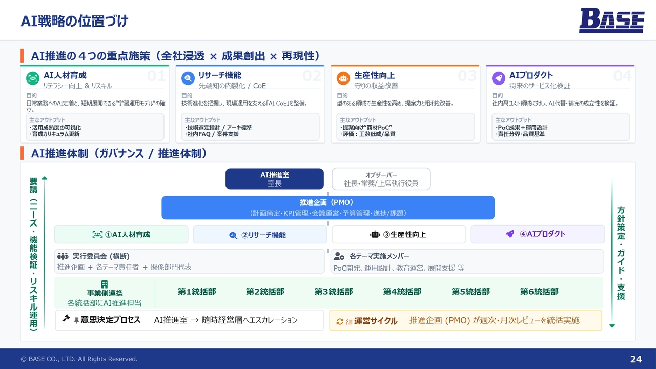 これらは単なる掛け声やコンセプトにとどまらず、AI推進室を設置し、各統括部と連携しながら、この4つの施策に取り組んでいます。