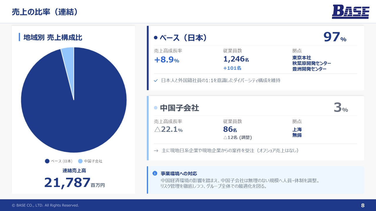 スライドの下部には、中国における数字も記載していますが、売上が減少しており、従業員数も12名の調整を行って86名に減少し、100名を下回っています。なお、オフショアをゼロにしており、現地のビジネスを中心に運営しているため、当社グループにとっての影響は軽微です。ただし、赤字を出さず、黒字を維持しながら少しずつ成長していく方針です。