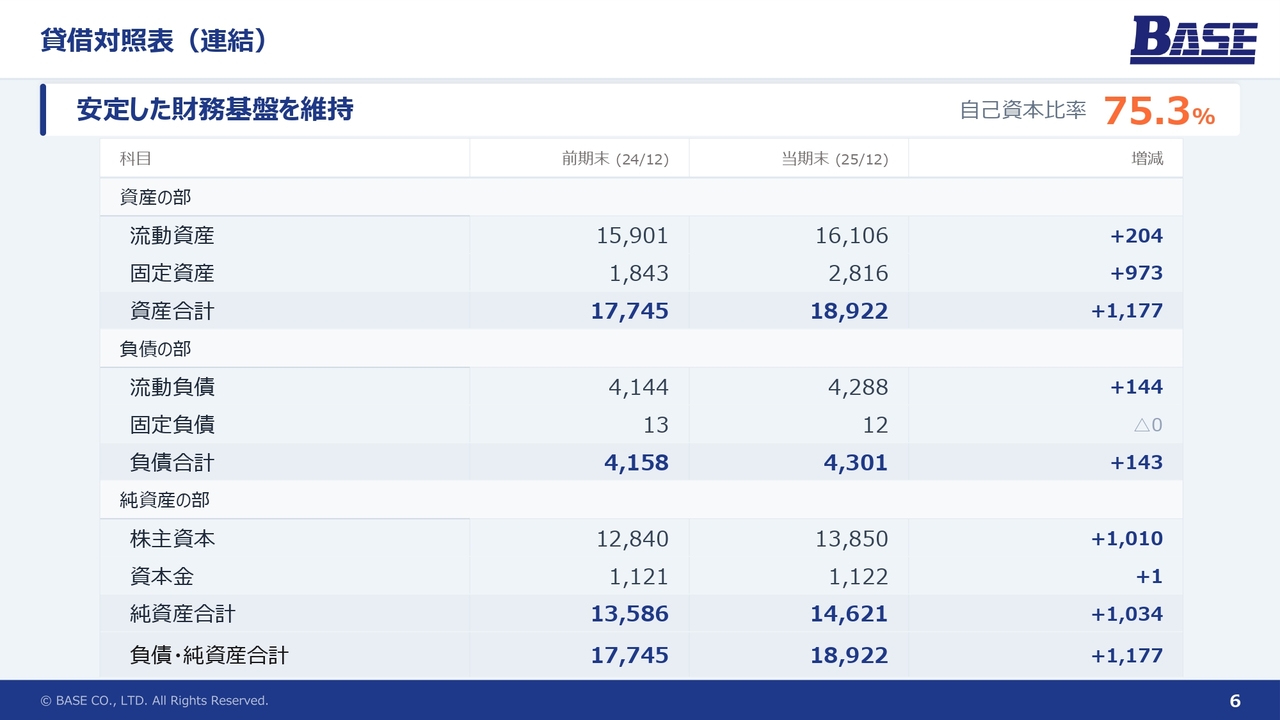 財務基盤はスライドに記載のとおりです。非常に堅調な財務基盤を構築できています。自己資本比率が75パーセントを超えており、安定していると捉えていただければと思います。