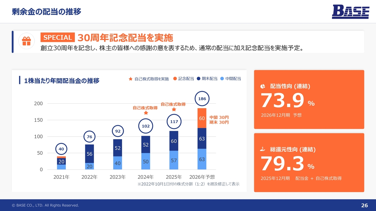 具体的には、記念配当として年間60円を実施します。内訳は、上半期に30円、下半期に30円です。さらに通常配当として上半期と下半期それぞれに63円ずつを加えます。これにより、配当性向は70パーセントを超える予定です。