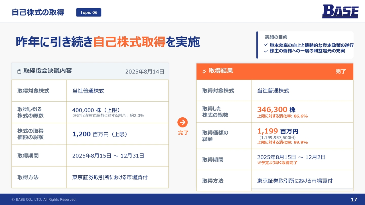 最後に、自己株式取得についてお話しします。今年で2年目となりますが、8月から実施しました。12億円を上限に自己株式取得を実施し、基本的にはほぼ消化しました。詳細については後ほどお話しします。