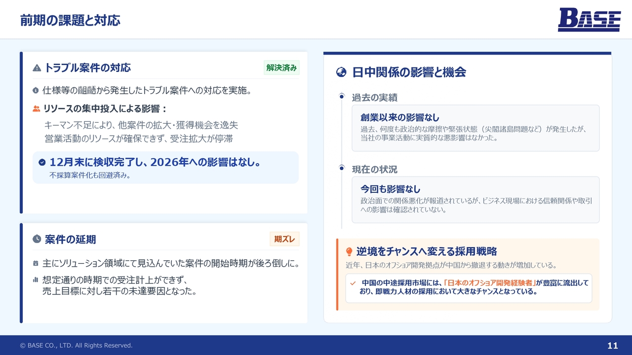 このように、2件のトラブルによる赤字は出ていませんが、実際の影響は大きかったです。現在は両方の問題が解決済みで、今年はその影響はないと考えています。しかし、不採算案件は時折発生しますので、そのような場合にはしっかりと報告していきます。