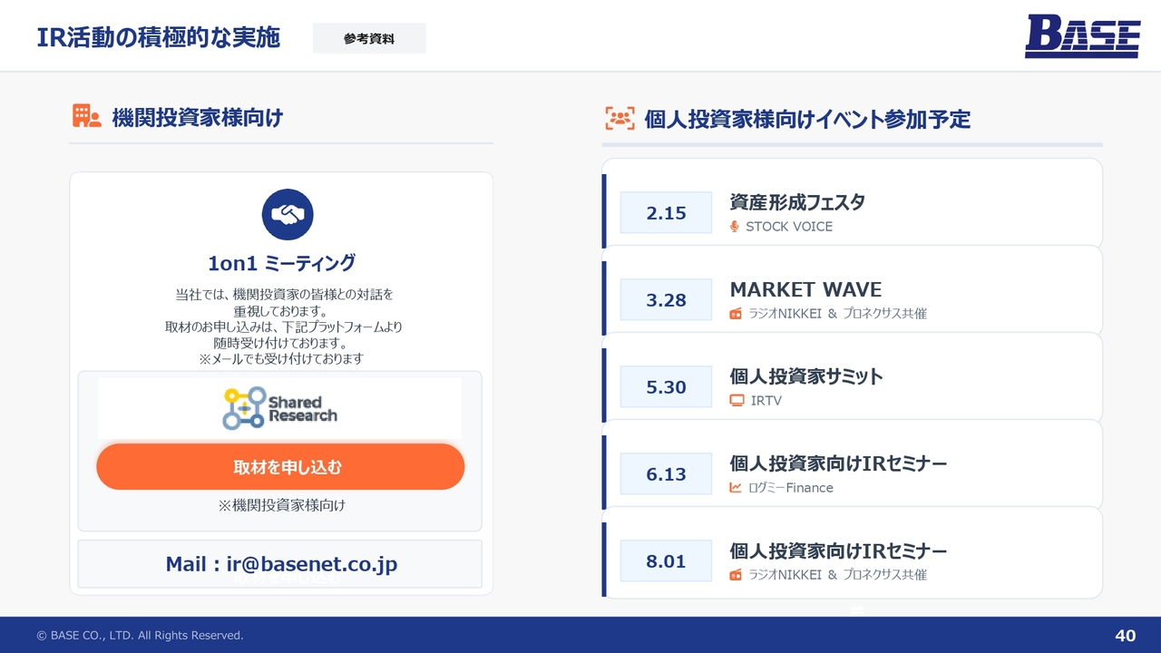 また、個人投資家向けの活動として、昨日も東証に向かい、「資産形成フェスタ」でお話ししました。今後は、攻めの姿勢でIR活動を進めていこうと考えており、チャンスがあればぜひご連絡ください。どこへでもうかがい、何時間でもお話しします。