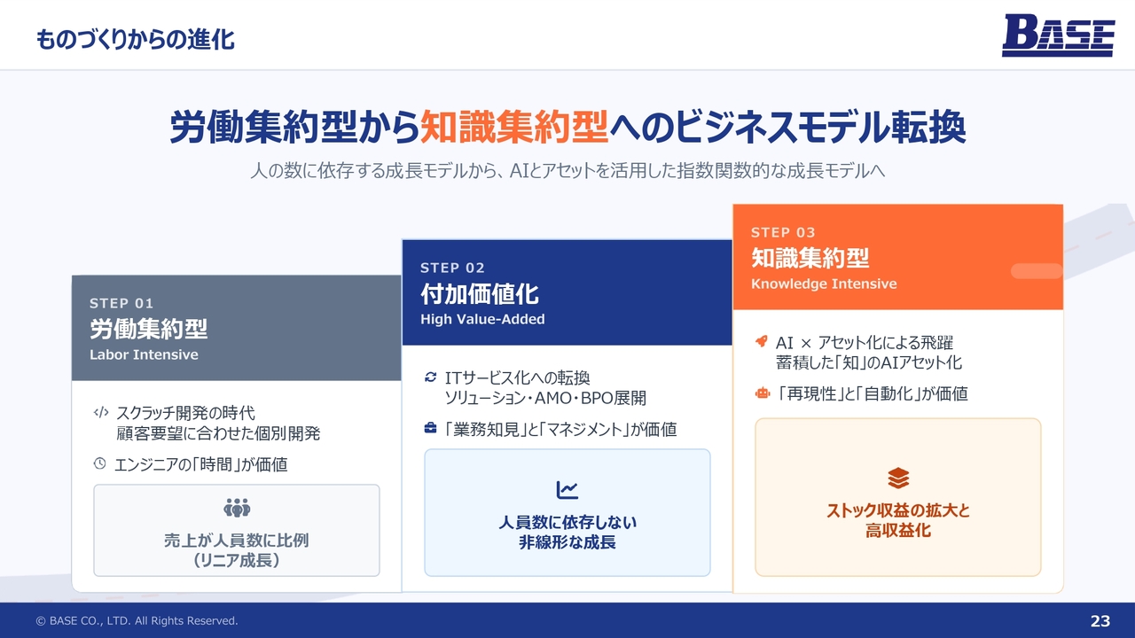 「ものづくりからの進化」についてです。現在は労働集約型の体制ですが、今後は付加価値の高い分野へと転換を図りたいと考えています。その後、知識集約型へ向けた取り組みを進めていく予定ですが、時間の都合により本日はその展開について詳しいご説明は割愛します。