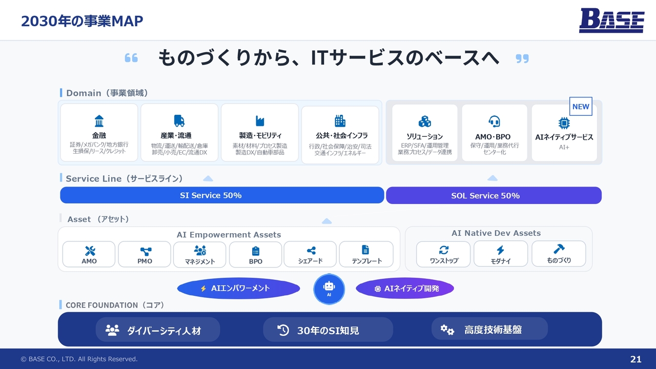 そうすることで、より収益性の高い、あるいは利益率が高いゾーンへシフトできると考えています。この計画において2030年の課題を一言で表すなら、「ものづくりから、ITサービスのベースへ」であり、その実現のための手段がAIとなります。
