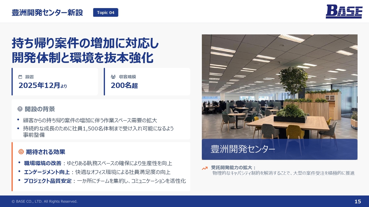 4つ目のトピックスです。豊洲に開発センターが完成しました。約200名収容可能な施設です。現在、社員数は約1,300名ですが、本社オフィス、秋葉原開発センター、豊洲開発センターの3ヶ所で、約1,500名まで収容できると考えています。