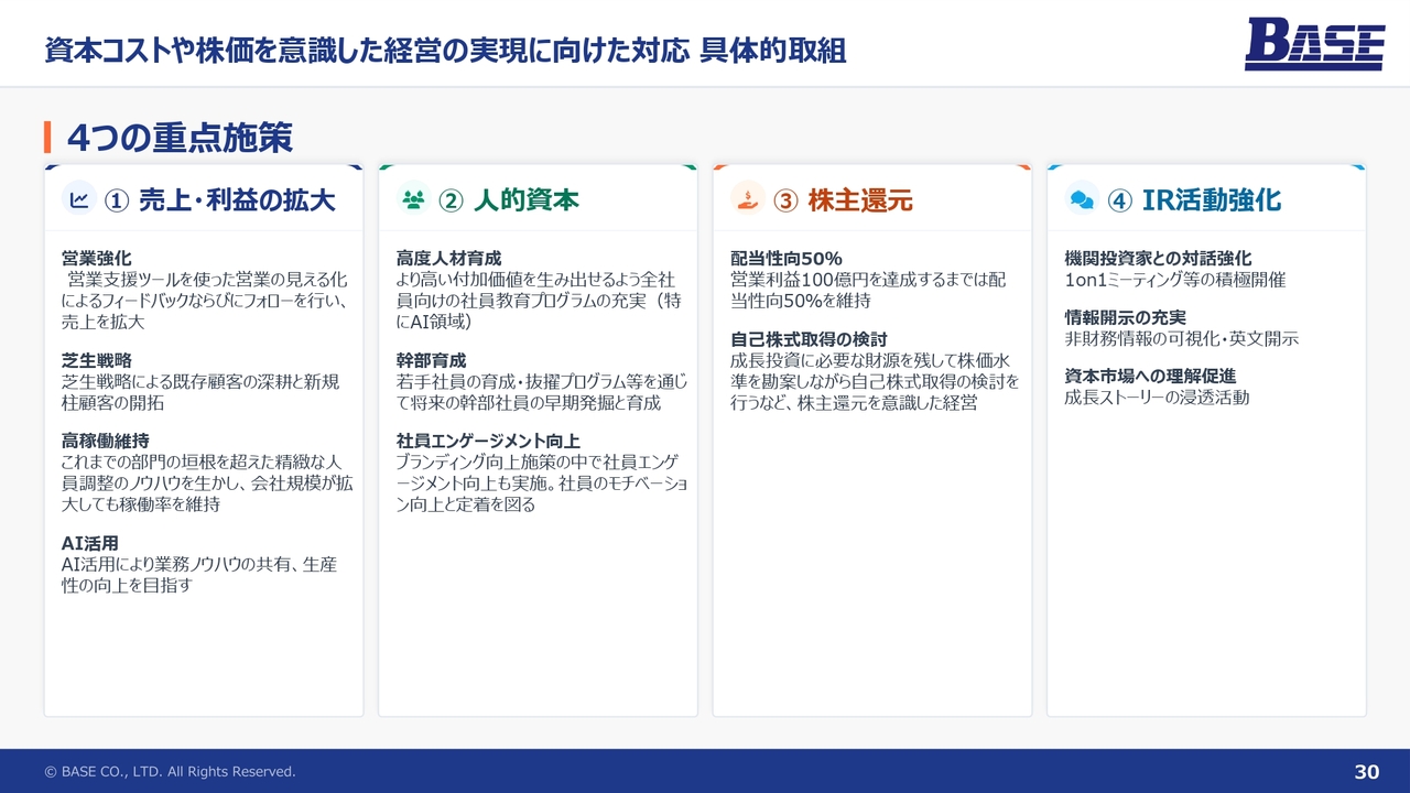 髙野哲行氏:常務取締役管理本部長兼財務部長の髙野です。当然、財務的な計画も「BASE 2030」では立てていますが、今のところは公表する計画はありません。申し訳ありません。