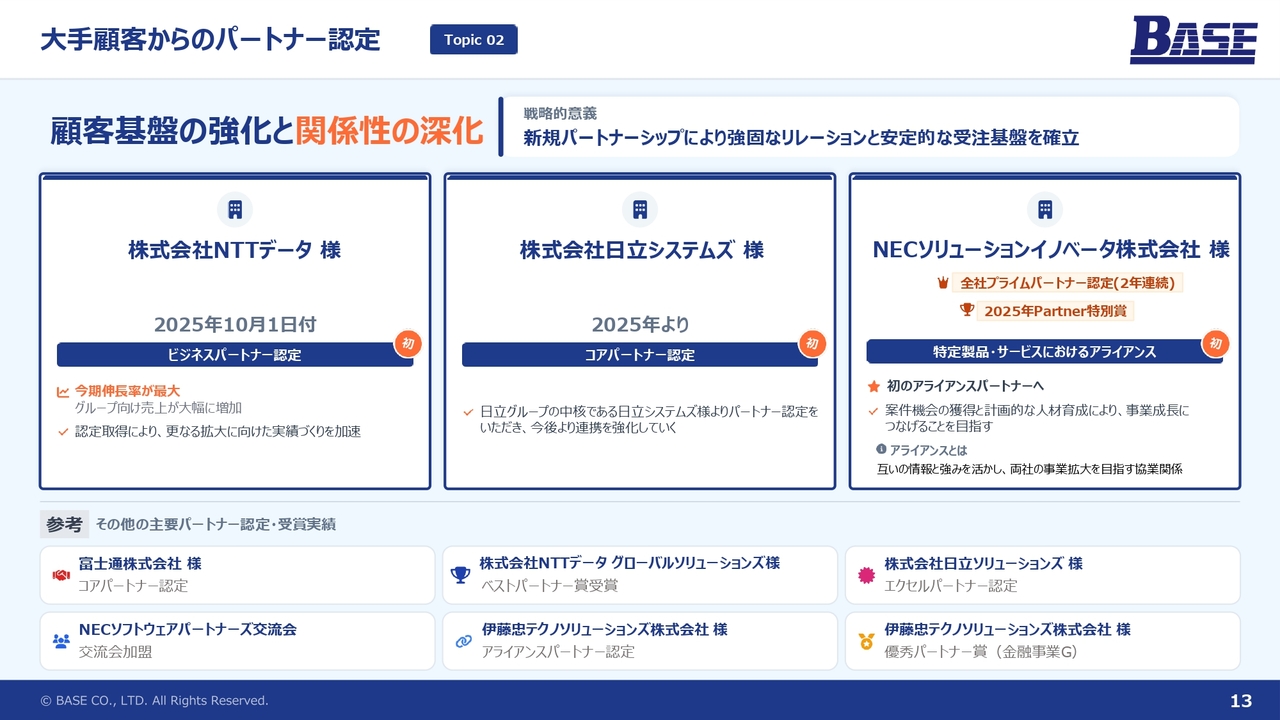 まず、NTTデータさまから受けた認定についてです。この認定はビジネスパートナーとしてのランクを示すもので、当社は非常に高いランクに認定されています。非常に難易度が高かったものの、私たちは努力を重ね、1年で必要な資格を取得し、2025年10月1日に認定を受けました。これは当社にとって非常に意義深い出来事です。