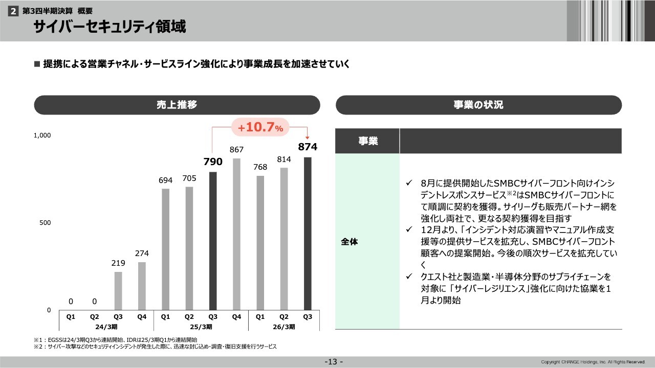 サイバーセキュリティ領域についてです。8月に提供開始したSMBCサイバーフロント向けインシデントレスポンスサービスは、前回の決算時にも説明しましたが、SMBCサイバーフロントにて現在も順調に契約を獲得しています。我々は販売パートナー網を強化し、さらなる契約獲得を目指します。