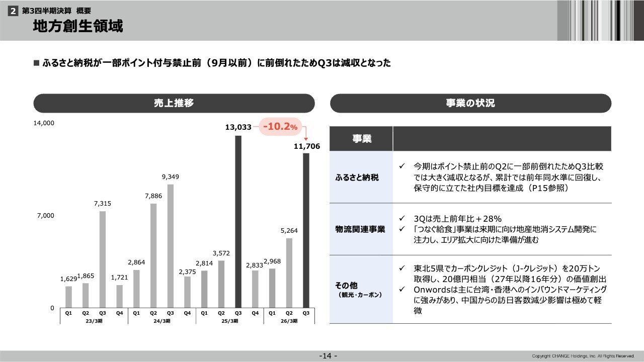 地方創生領域についてです。スライド左のふるさと納税の売上推移を見ると、2025年3月期は、第3四半期がピークで、第2四半期にはそれほど大きな山がありません。