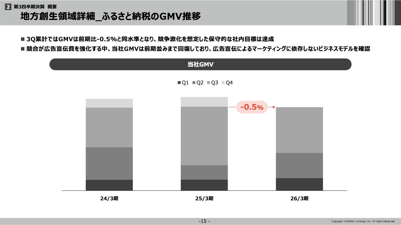 ふるさと納税のGMV推移です。第3四半期は前年に比べ減少していますが、第2四半期の増加と第3四半期の減少を最小限に抑えることで、ほぼ前年並みのGMVに回復させることができました。