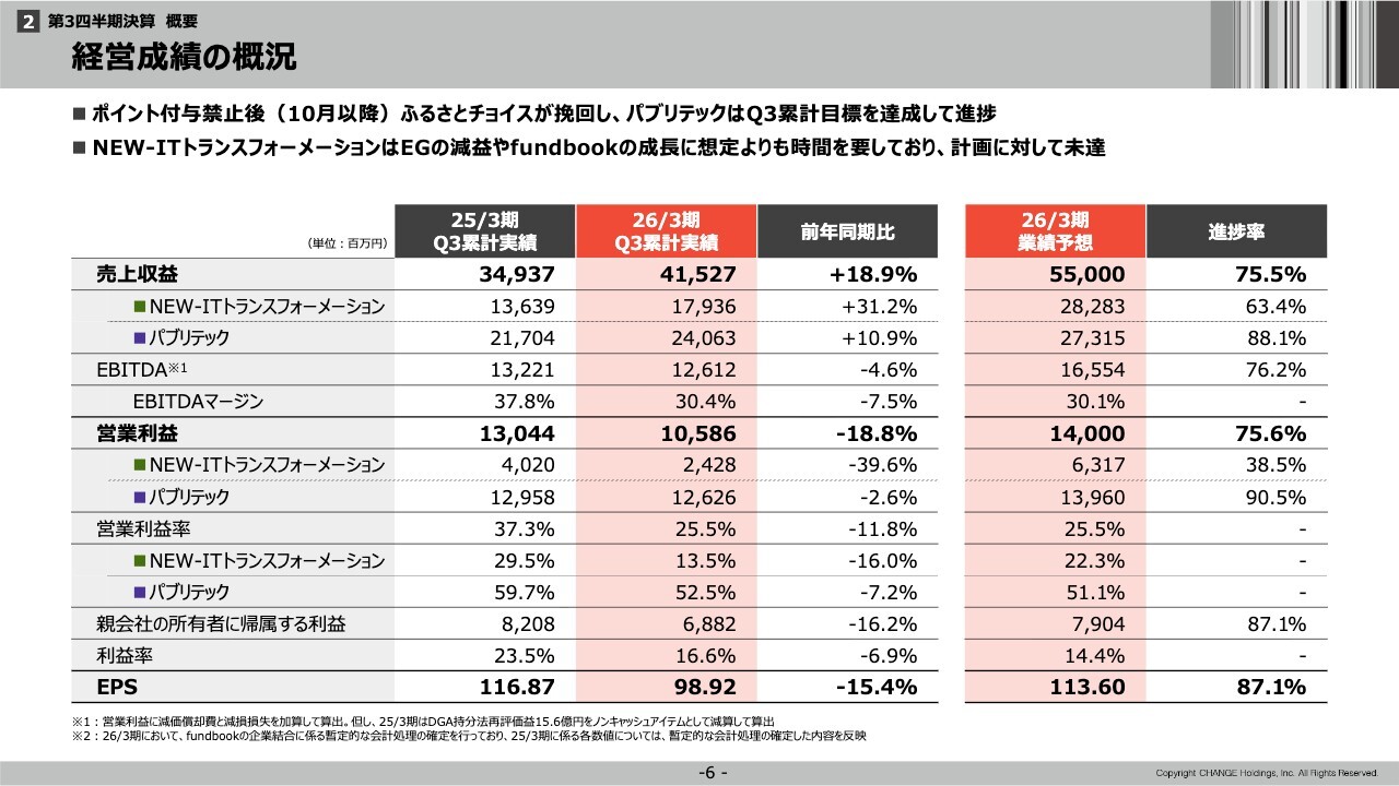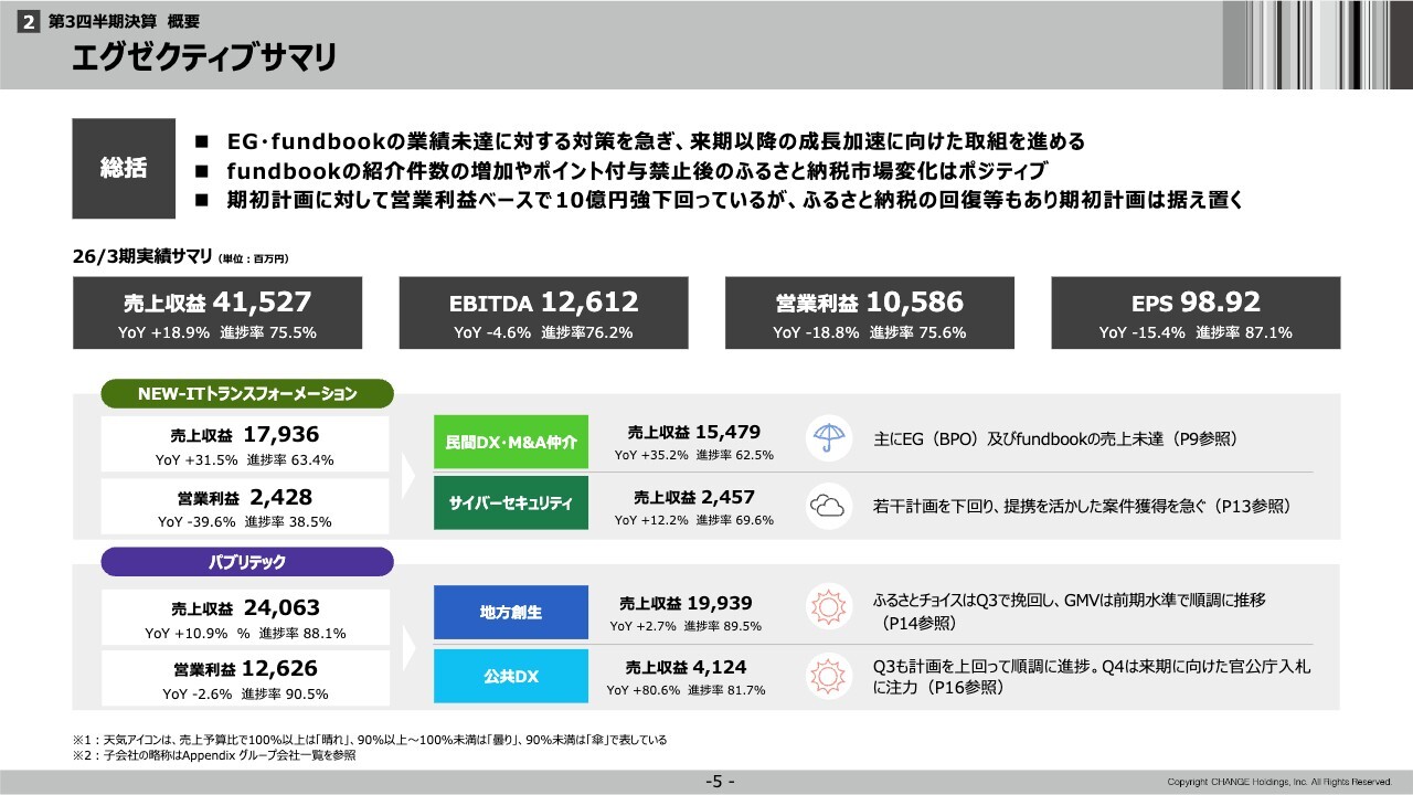 事業概況についてです。NEW-ITトランスフォーメーション事業では、民間DXやM&A仲介において、スライドに雨マークがついているように、イー・ガーディアンのBPO事業やfundbookが当初計画していた成長スピードを達成できていません。