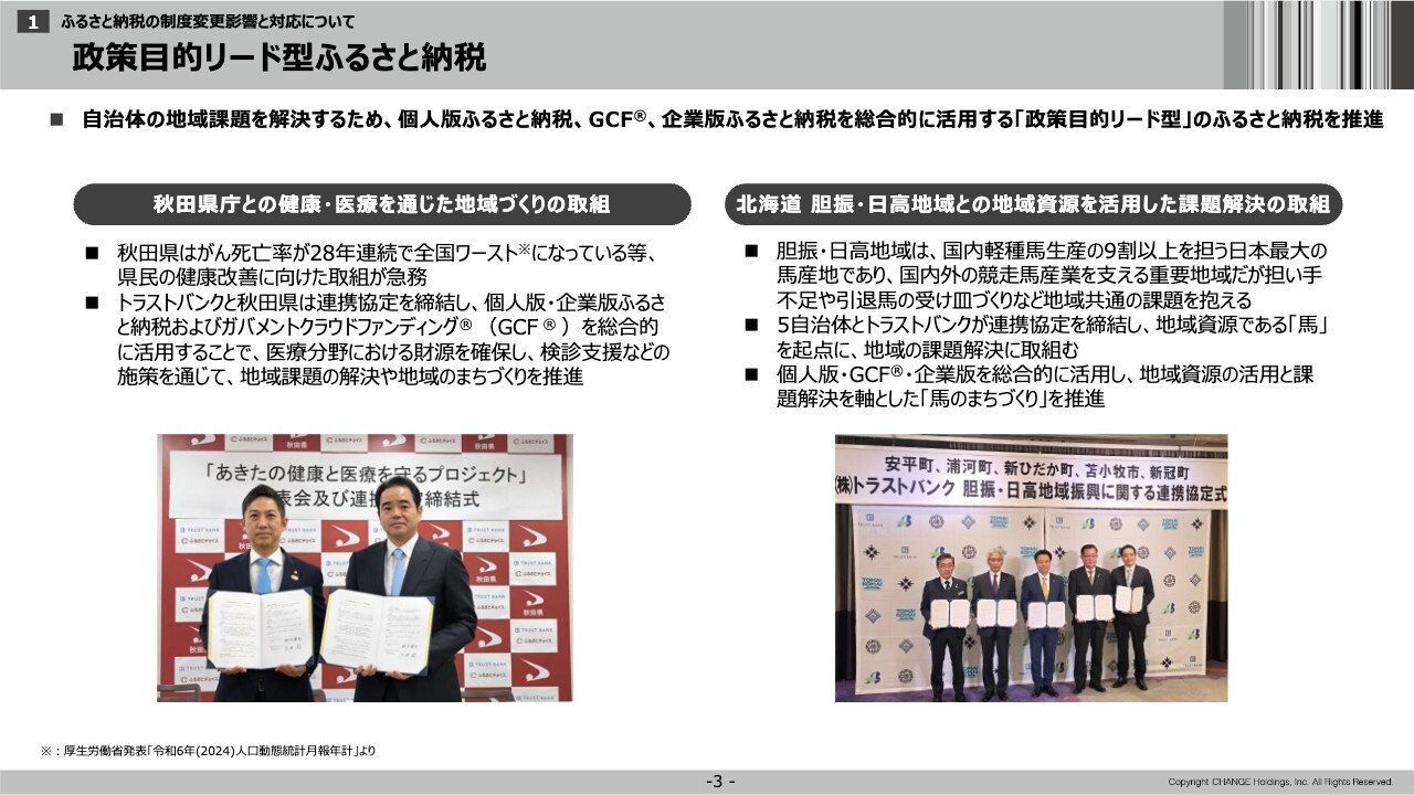 昨年末に取り組んだ事例をご紹介します。スライド左側に示したのは、秋田県庁との健康・医療を通じた地域づくりの取り組みです。県民の健康改善が急務となる中、トラストバンクと秋田県が協力して個人版・企業版ふるさと納税およびGCFを総合的に活用しました。医療分野における財源確保や健診支援などの施策を通じ、地域課題の解決や地域のまち作りを推進するという内容です。