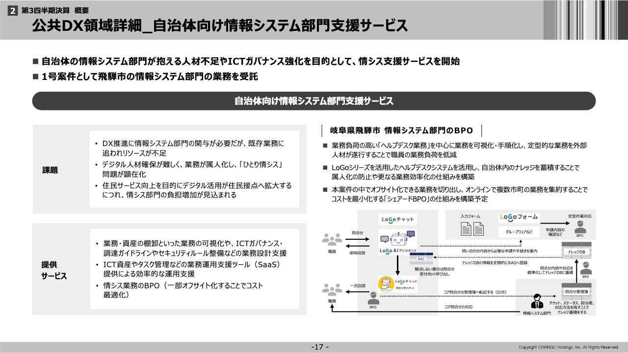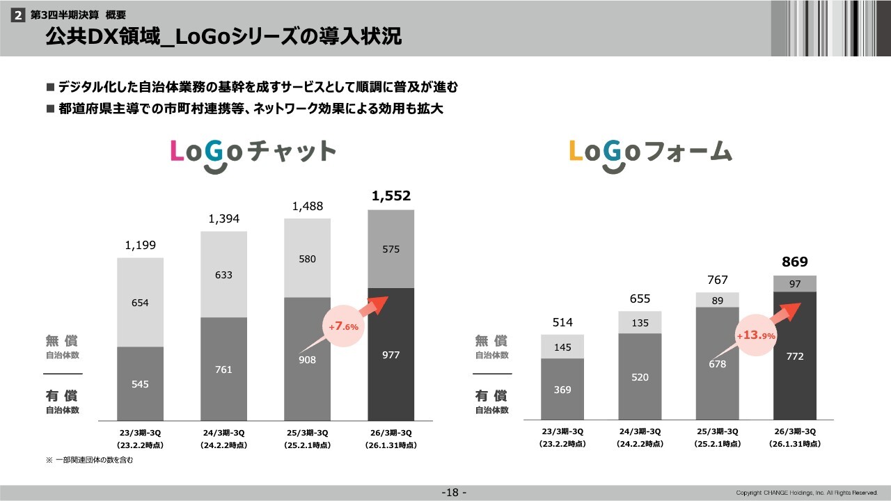 公共DX領域についてです。「LoGoシリーズ」の利用自治体が、「LoGoチャット」で1,550自治体、「LoGoフォーム」で860自治体を超え、堅調に拡大しています。
