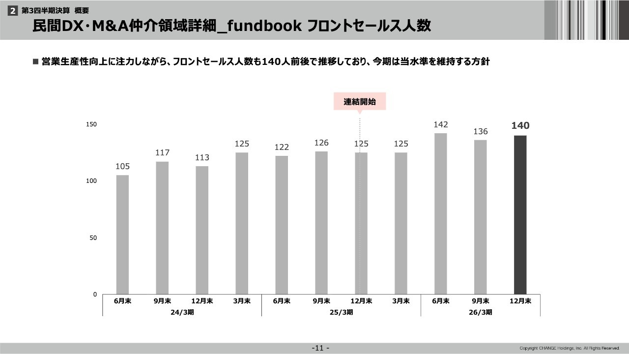 フロントセールスの人数は140名前後で推移しており、今期はこの水準を維持する予定です。