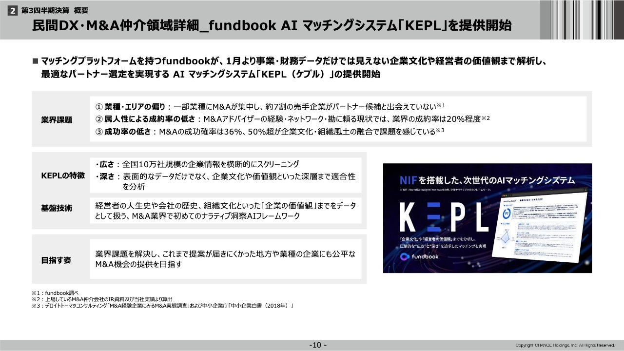 また、AIマッチングシステム「KEPL」をリリースしました。こちらについては後ほど解説します。このように、M&A仲介事業に関するKPIは一定の基盤が整ったため、来期以降に開示する方針です。