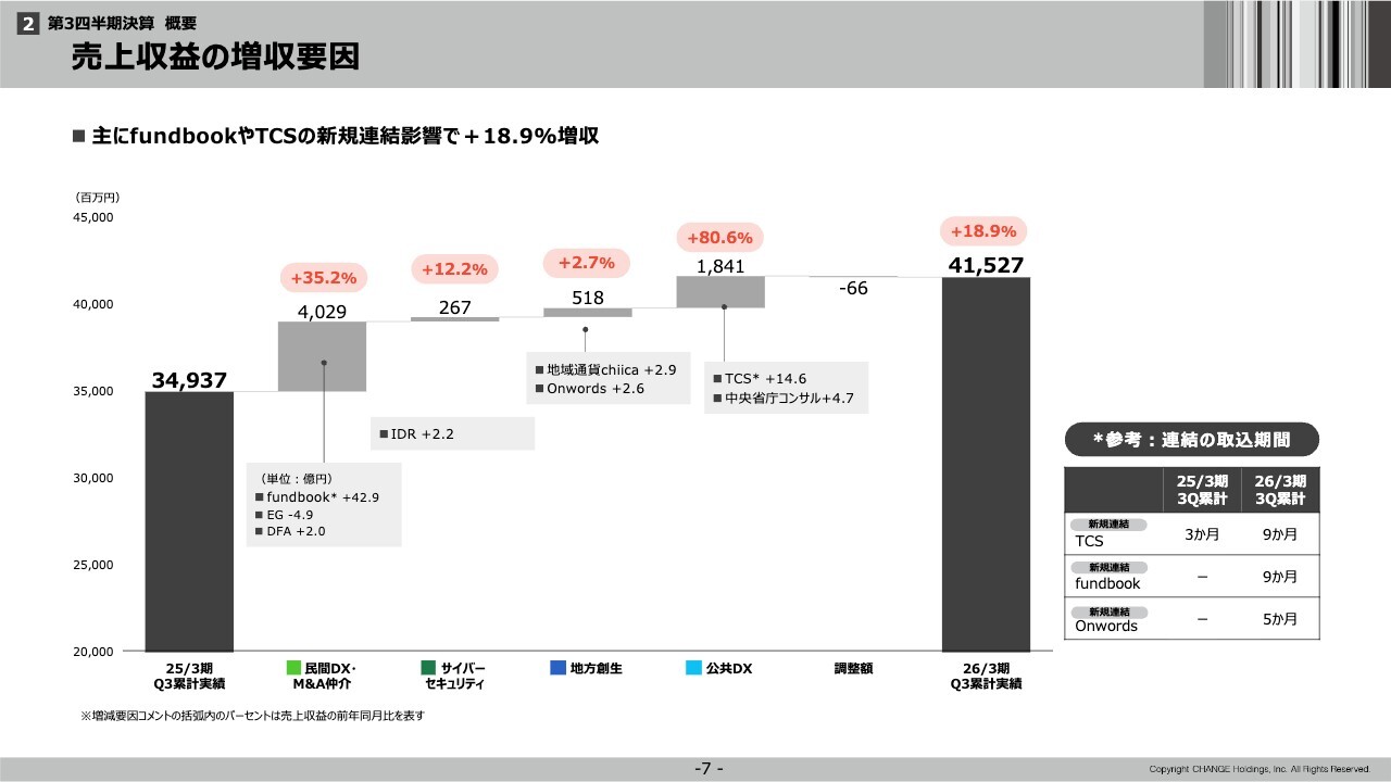 売上収益の増収要因についてです。前期の約350億円に対し、民間DX・M&A仲介で約40億円を上積みしました。その内訳として、fundbookは約43億円の増収、イー・ガーディアンは約5億円の減収があり、売上全体では前期比35.2パーセントの増加となりました。