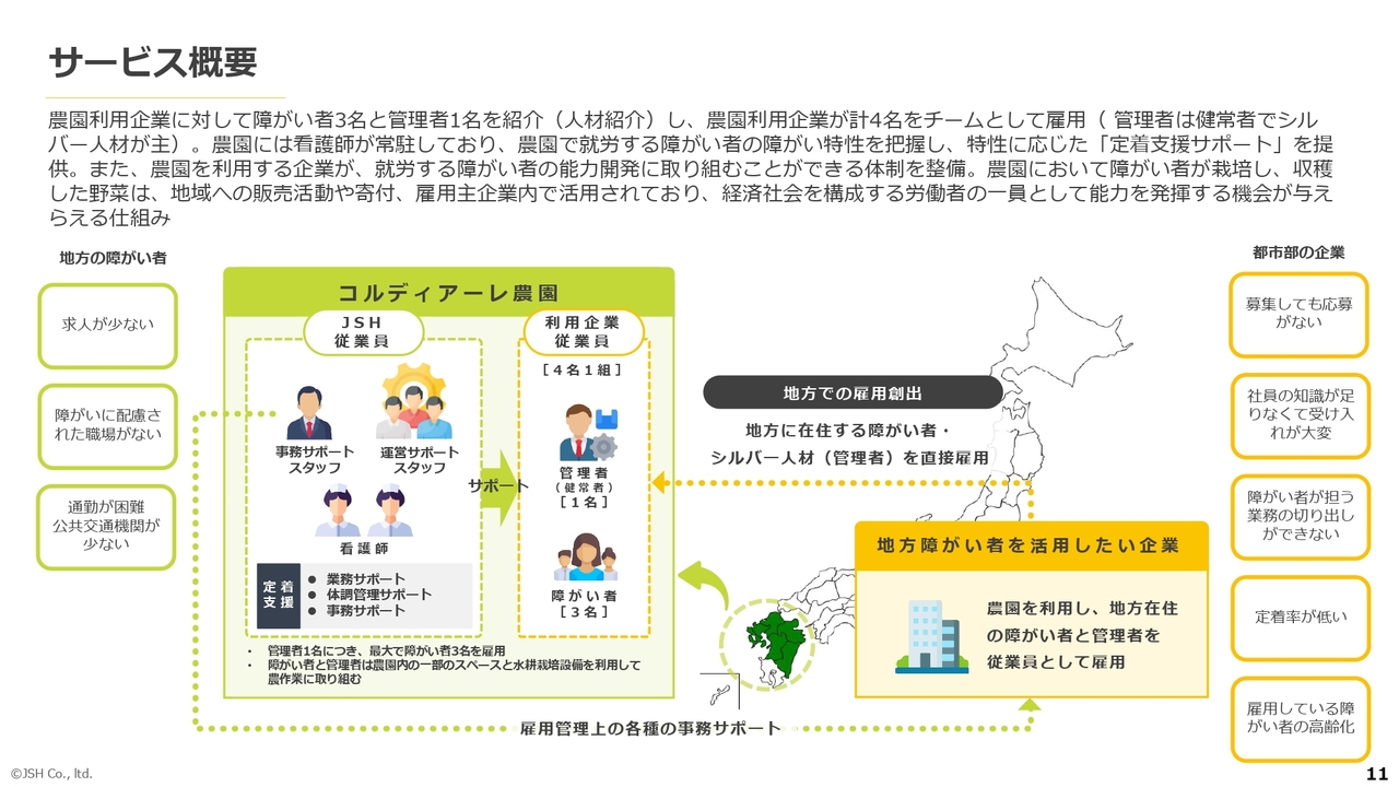サービス概要をご説明します。当社が運営する「コルディアーレ農園」の一部区画を企業に貸し出し、障がい者の方や管理者の方を企業に紹介して雇用していただきます。その後、日々の野菜作りをサポートし、収穫した野菜を食堂で活用したり、子ども食堂に寄付したりすることで、CSR活動となるような仕組みのサービスです。
