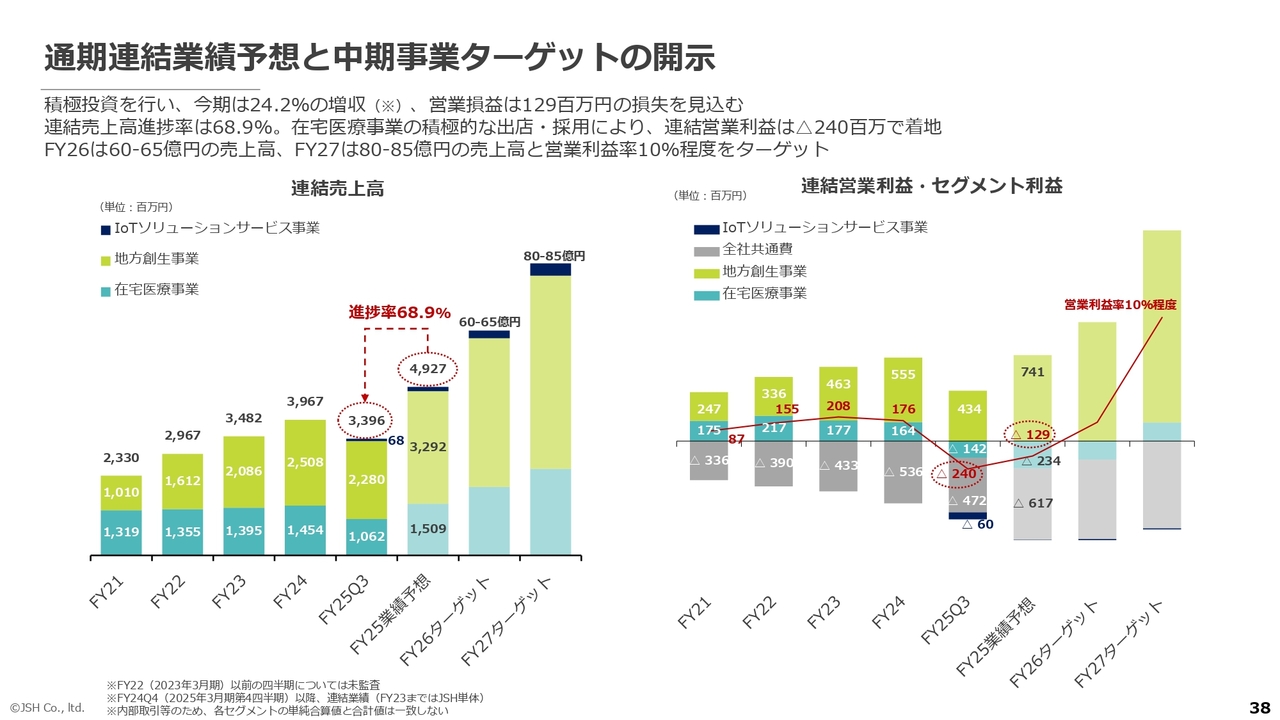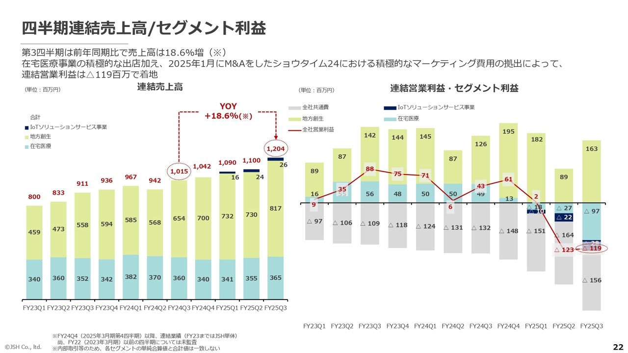 ここからは、在宅医療事業も改善が進むと考えられ、地方創生事業は利益を大きく積み上げることが期待されます。ショウタイム24に関しては利益を出せる体質に変わりつつあり、今後はさらなるマーケティング費用の積極化による成長を目指します。この過程では、ある程度の損失を伴いながらも、売上高の拡大を目指す動きになる見込みです。