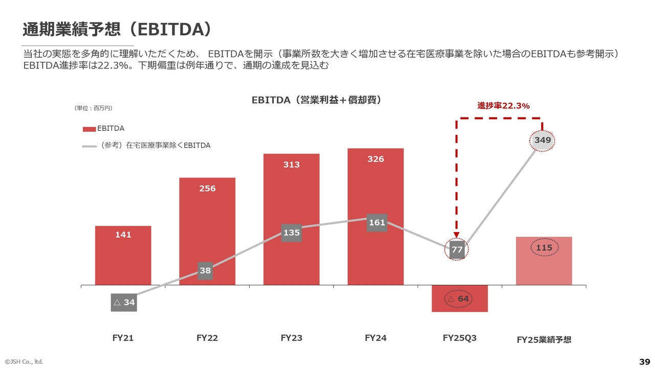 EBITDAについてご説明します。スライド右端の今期業績予想では、EBITDAは1億1,500万円、在宅医療事業を除くEBITDAは3億4,900万円と見込んでいます。在宅医療事業では積極的な投資を行っているため、その影響を除いた実態を把握いただく目的で、昨年からこの数値を開示しています。