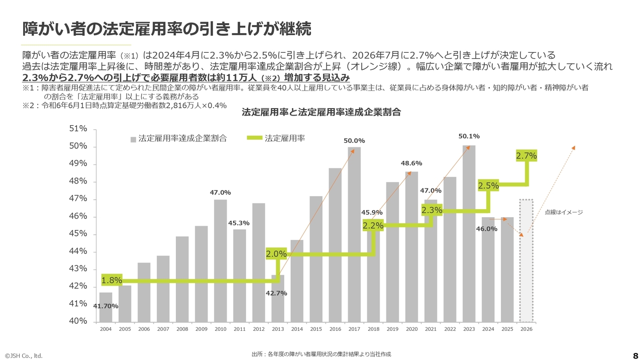 このような推移は、当社サービスの質の高さや、法定雇用率が徐々に上昇しているという追い風も影響しています。これらが、障がい者雇用支援事業のさらなる拡大を支える要因となっています。
