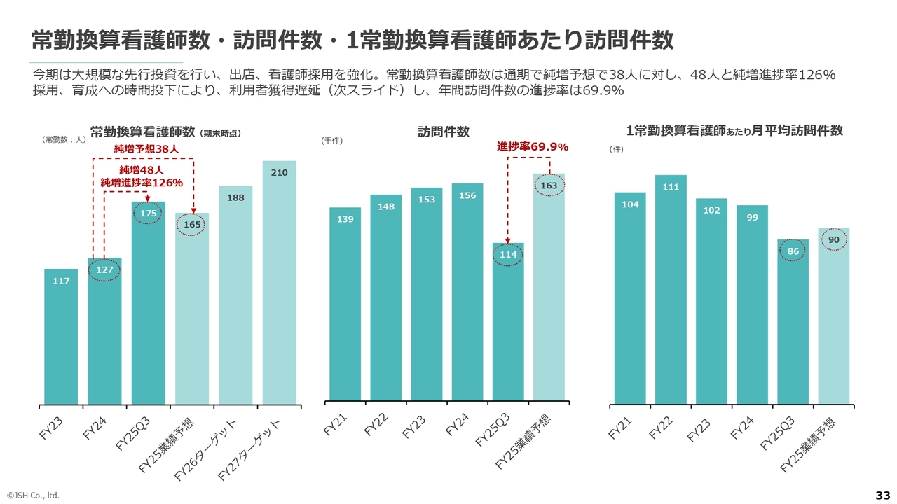 在宅医療事業のKPIについてです。今期末は165人で着地する想定でしたが、現在は175人と大きく純増しています。ただし、第4四半期に退職される方なども含めると、最終的には165人前後で落ち着く見込みです。現状としては、純増が進み、看護師の採用や離職率の低下が順調に推移しています。