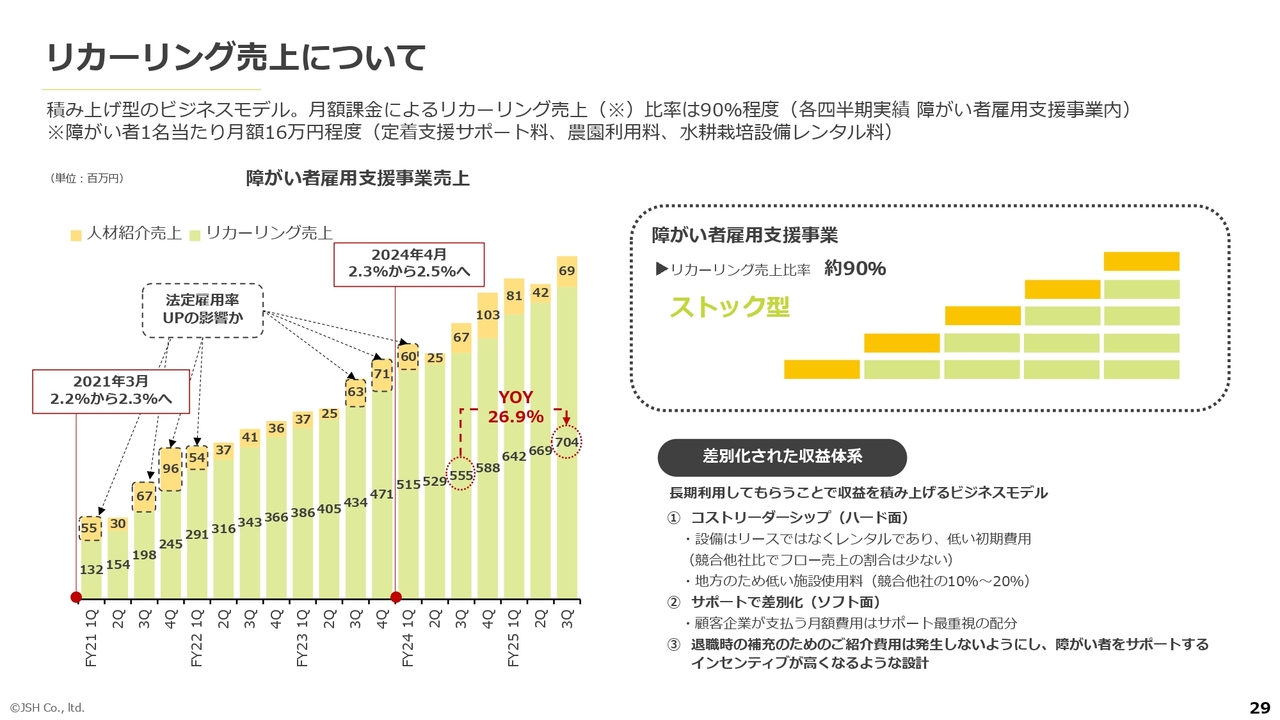 リカーリング売上はスライドのような状況です。YoYで26.9パーセント増加しています。引き続き、地方創生事業の中での障がい者雇用支援事業のリカーリング売上比率は約90パーセントとなっており、安定的に積み上がっています。