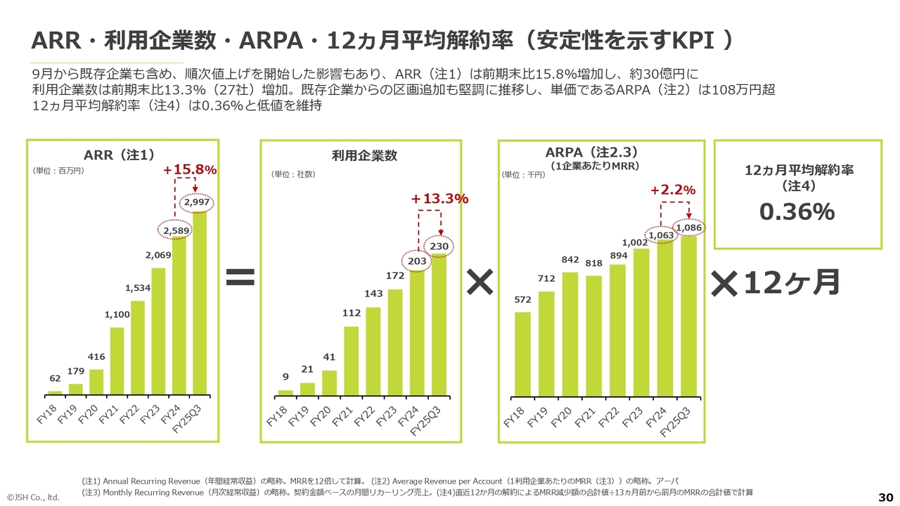ARR・利用企業数・ARPA・12ヵ月平均解約率(安定性を示すKPI )