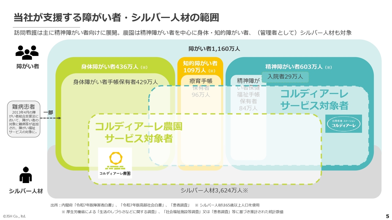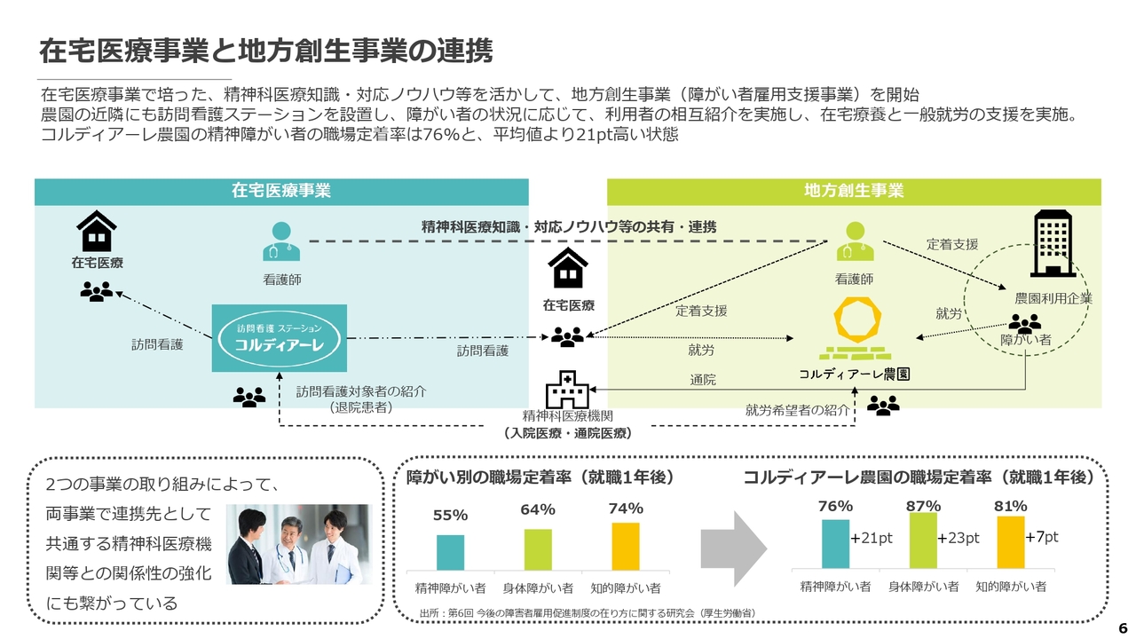スライドの図で示すように、当社は在宅医療事業と地方創生事業を行っています。この2つの事業は精神科医療機関との結びつきが強く、医療機関と良好な関係を築くことが重要です。在宅医療事業のノウハウを活用し、地方創生事業では障がい者雇用の農園も運営しており、職場の定着率においても優位なポジションを確立しています。