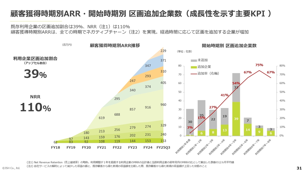 このように、追加オーダーがいただける状況に加え、解約率が非常に低くなっています。中央のグラフは、顧客獲得時期別にARR(Annual Recurring Revenue、月額課金の12ヶ月換算)を示したものになっています。これを見ると、基本的にすべての時期でネガティブチャーン、つまり解約による減少を上回る増加が見られます。