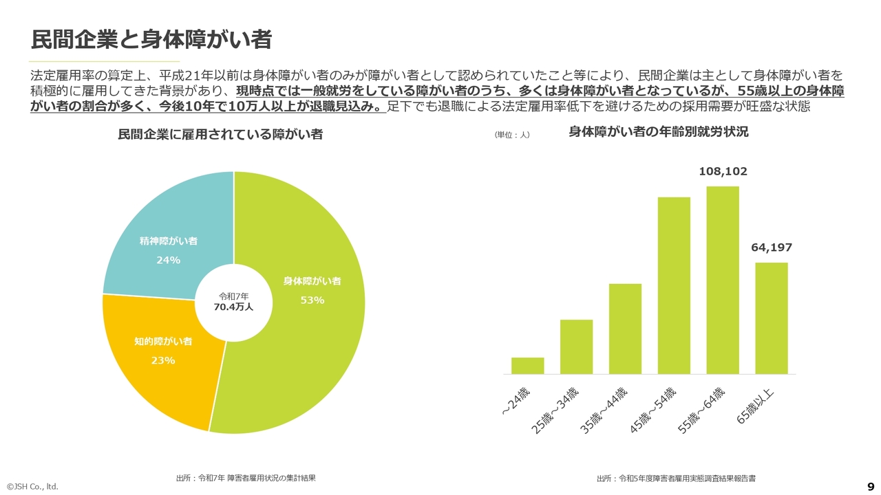 昨年6月1日時点で、約70万人の障がい者の方が一般就労しています。そのうち半分程度が身体障がい者であり、働いている方々の高齢化が進んでいます。このため、定年退職などにより、今後10年で10万人以上が退職する見込みです。