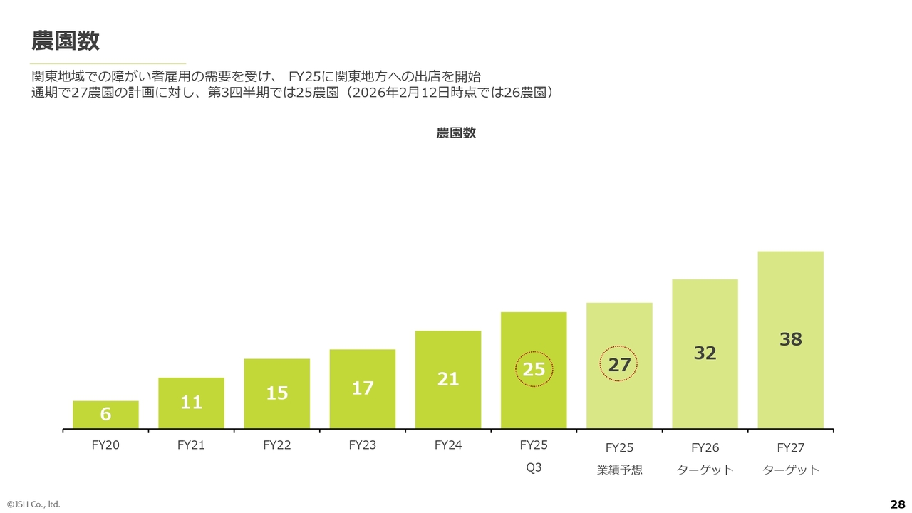 農園数は27の予定でしたが、12月末時点で25、足元では26となり、今期はこの26で終了する見込みで、予想より1つ少ないかたちで終わる想定です。