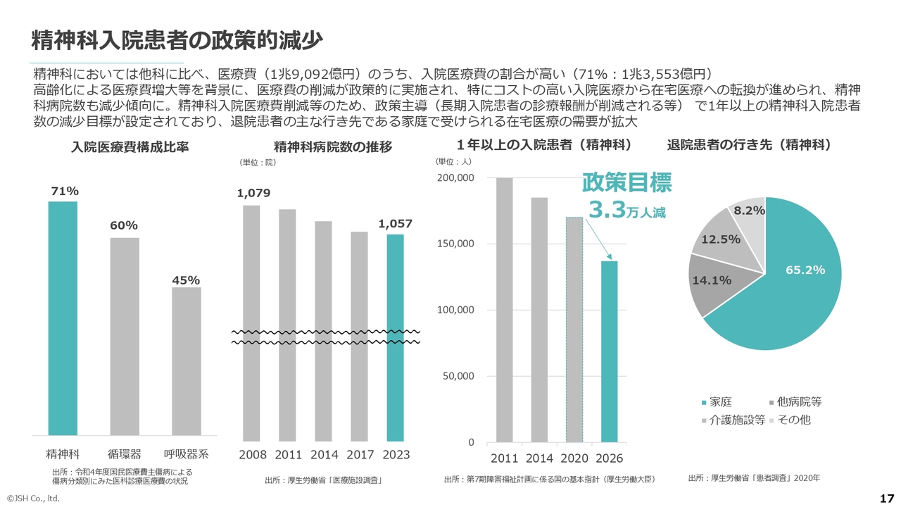 特に精神科では入院の割合が多く、入院が医療費を増大させやすいことから、それを減らすために在宅医療を推進する国の動きがあります。精神科病院の数は今後増加する見込みはなく、1年以上の長期入院患者を減らしていく方向で進められています。