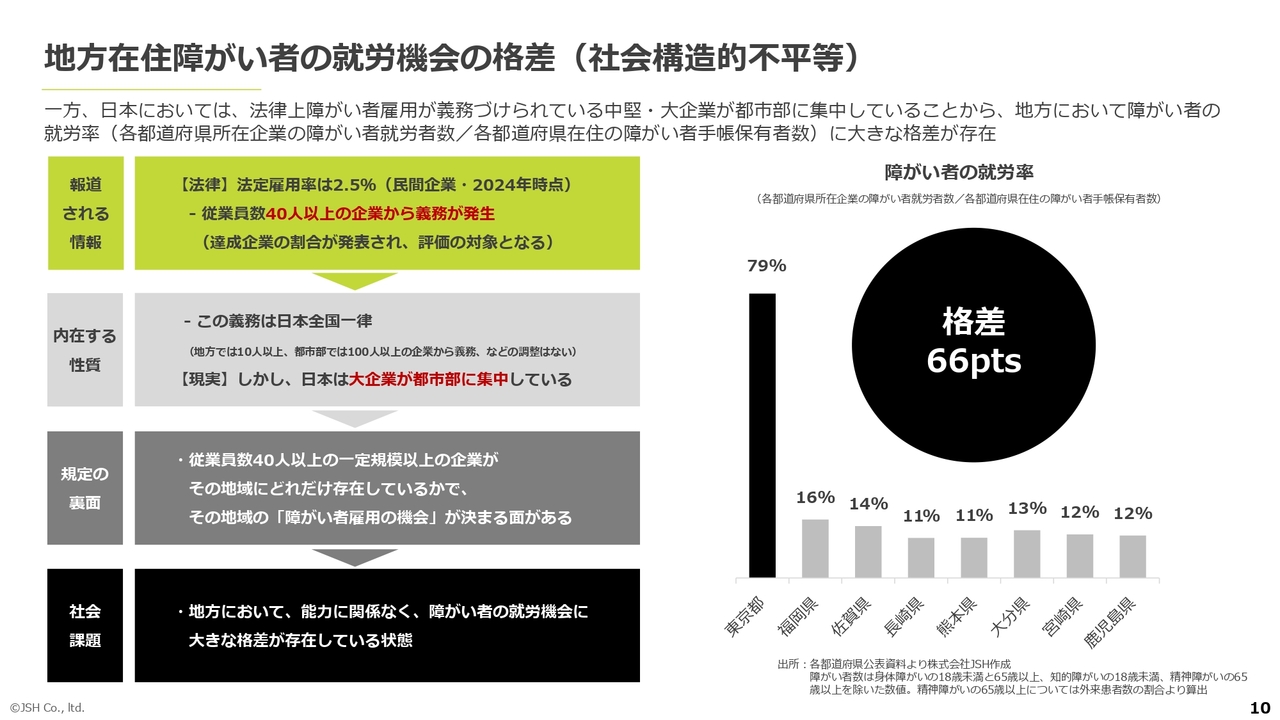 一方で、地方格差も存在します。当社が地方創生事業として障がい者雇用支援事業を行っている理由の1つが、スライドに記載した課題にあります。東京都では障がい者の方が働きやすい環境が整っていますが、それ以外の地域では、障がい者の方々と障がい者を雇用する企業に対する比率がアンバランスな状況です。