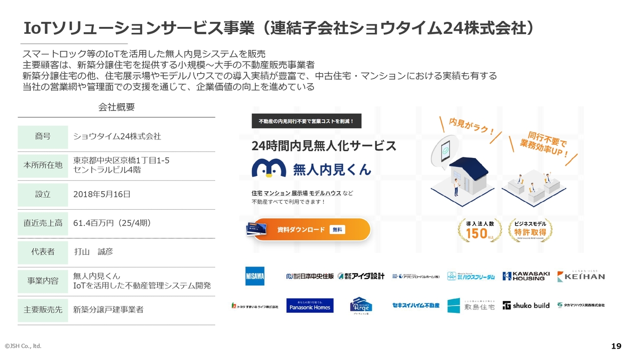 IoTソリューションサービス事業について簡単にご説明します。こちらは連結子会社であるショウタイム24株式会社に関するものです。「IoTソリューション」の名称のとおり、スマートロックをはじめとしたIoTを活用した無人内見システムを販売しています。このスマートロックは、物理的な鍵を使用せずにQRコードなどで鍵を開けて中に入ることができる仕組みです。
