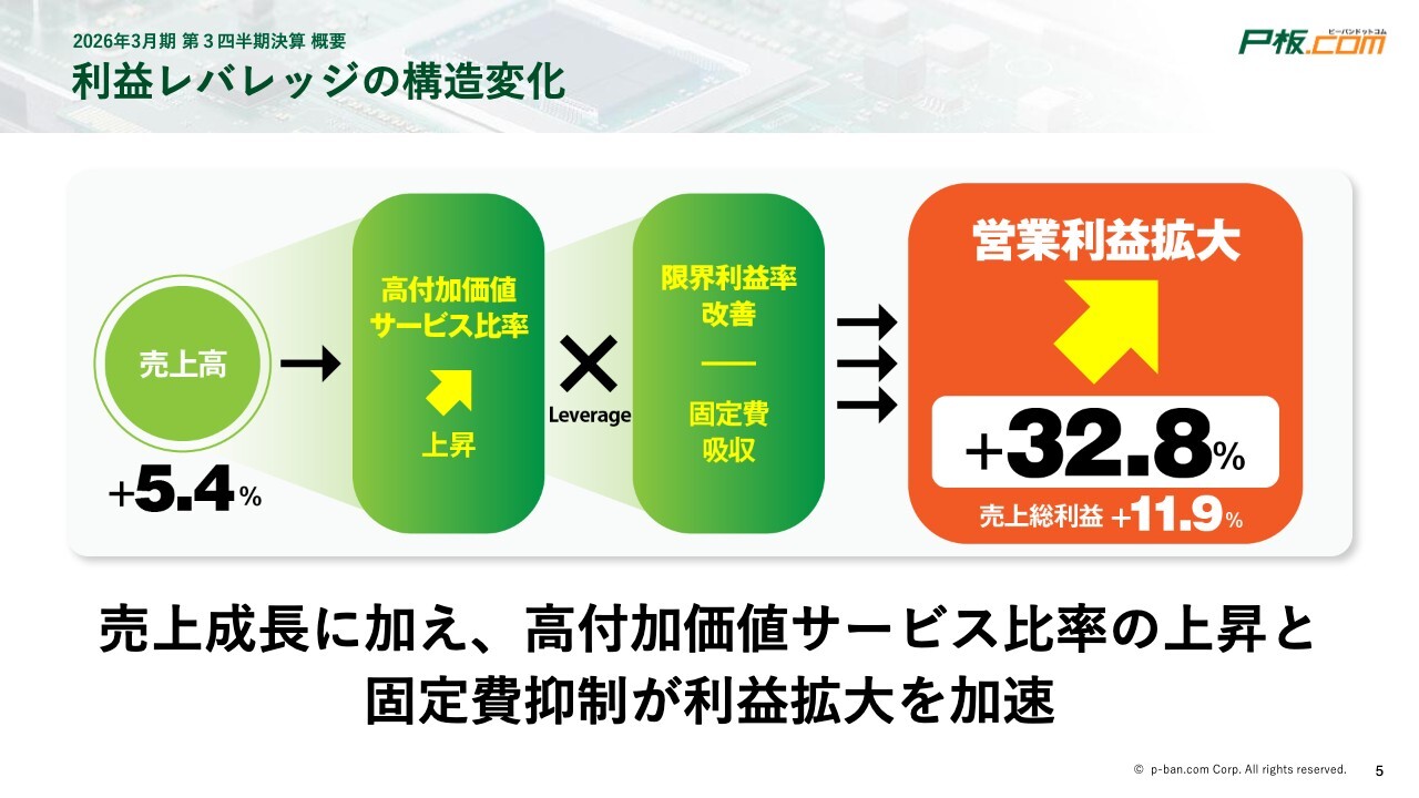 司会者:先ほどのお話にもあったように、高付加価値サービスと固定費抑制を続けて市場を広げていくことで、売上のトップラインが自然に伸び、利益率も高くなるということですね。