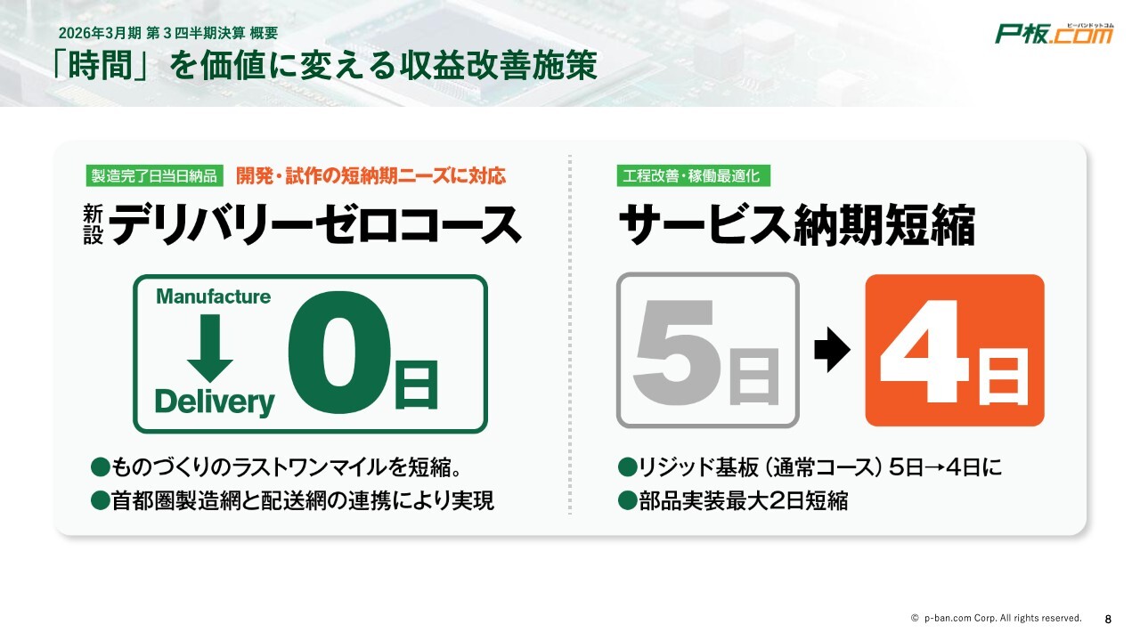 後藤:はい。もう1点、各種サービスとして、例えば生板の製造サービスや先ほど言ったはんだ付けを行う実装サービスなどさまざまなサービスがあり、この基本納期を一律で短縮しています。