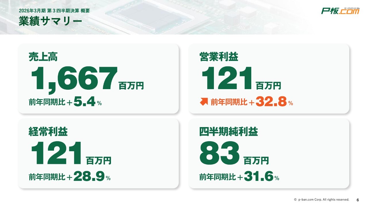 司会者:続いて、業績サマリーです。売上高は16億6,700万円で前年同期比5.4パーセント増加、営業利益は1億2,100万円で32.8パーセント増加、経常利益は1億2,100万円で28.9パーセント増加、四半期純利益は8,300万円で31.6パーセント増加しています。